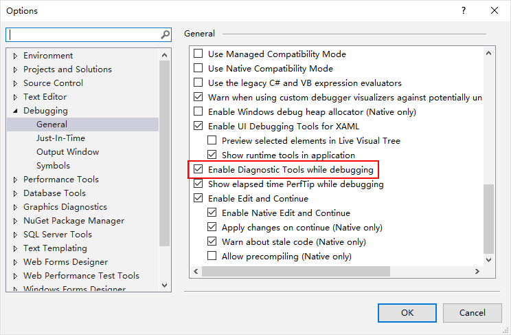 调试时自动打开分析工具。找到这个选项 “Enable Diagnostics Tools while debugging”,去掉勾选。